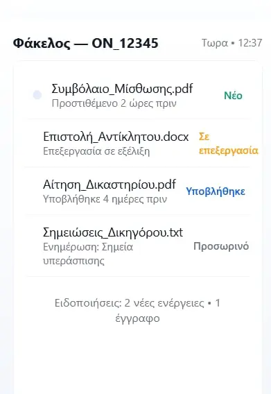 Με τον Online Φάκελο έχετε 24/7 πρόσβαση σε όλα τα έγγραφα και κάθε ενέργεια που ετοιμάζουμε για εσάς – διαφάνεια, ασφάλεια και πλήρης έλεγχος όπου κι αν βρίσκεστε.
